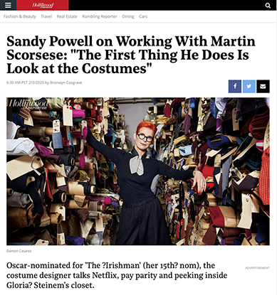 I contribute to the Hollywood Reporter, writing in-depth stories about costume designers including Sandy Powell, Heidi Bivens, Marci Rodgers and Michael Wilkinson.